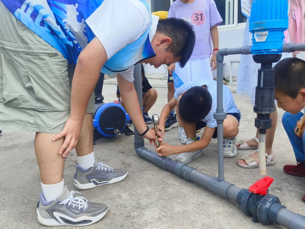 本次活动依托学院全国科普教育基地资源,融合数字仿真、智能互动等前沿技术,为0-14岁儿童量身打造了八大特色科普场馆。在水工学院实训楼的“数字流域动态仿真中心”,孩子们通过高精度仿真模型,直观感受溪洛渡拱坝等水利工程的运行原理;在“智能节水装置互动区”,家庭节水装置与拼图游戏结合,让环保理念深入人心。管工学院“奉茶盖碗体验区”则通过长嘴壶茶艺展示与科技知识问答,生动诠释水与茶文化的千年智慧。
