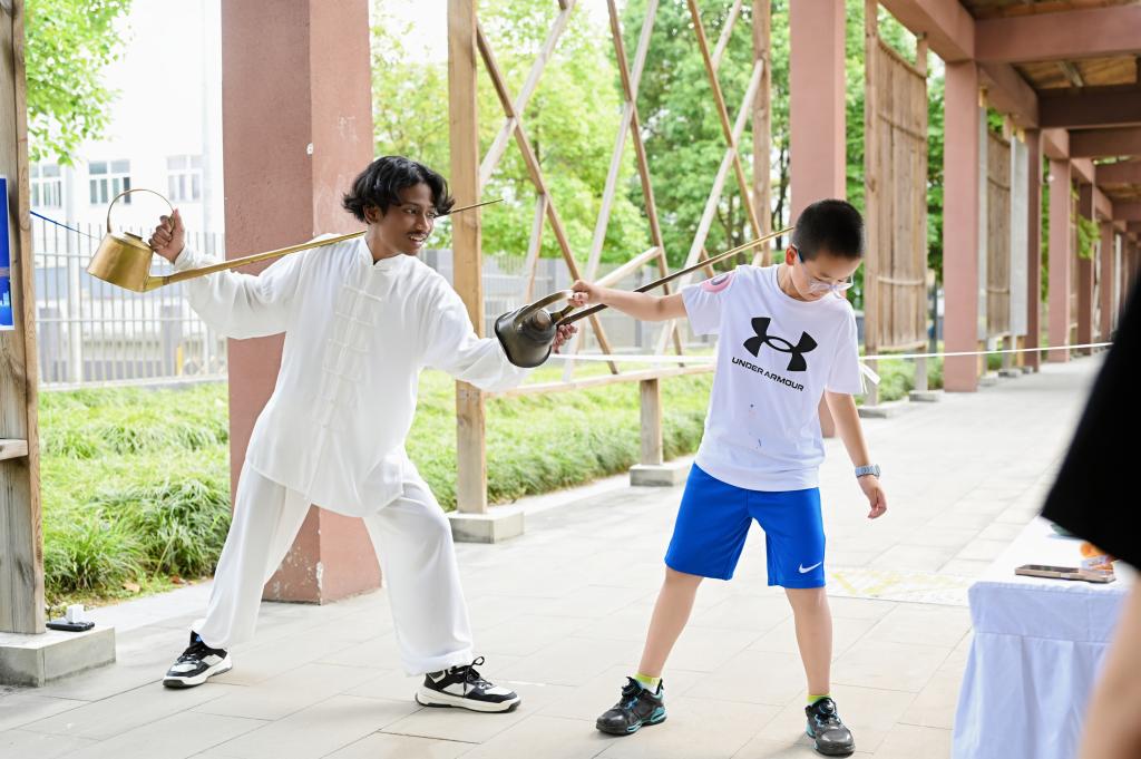 在“水粒子探险队”节水科普宣传点,跨国留学生志愿者通过生动有趣的图片、问答等互动游戏,向孩子们传递节水和茶水文化知识。用图文形式展示各国节水口号,让孩子们了解全球节水的共同信念。