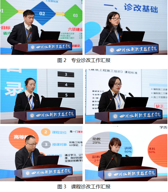 《建筑工程技术》专业负责人冯金钰、《建筑工程施工组织设计》课程负责人赵楠、《工程测量技术》专业负责人李开伟、《测绘基础》课程负责人周小莉、《高等数学》课程负责人张章华、《大学英语》课程负责人欧阳冉冉分别就自己所负责的专业或课程的诊断与改进情况进行了汇报。