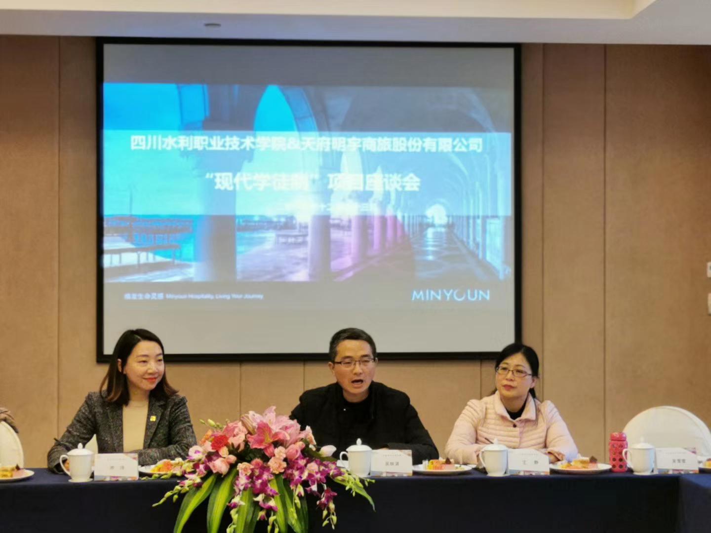 2019年12月23日,管理工程系吴映清主任、酒店教研室主任王静、实训老师吴雪莹一行三人赴天府明宇商旅股份有限公司旗下尚雅饭店参加2018级酒店管理专业明宇英才班学徒制座谈会。天府明宇商旅集团人力资源总监陈琦、副总监杰佐晶晶出席座谈会,会议由天府明宇商旅集团人力资源副总监杰佐晶晶主持。