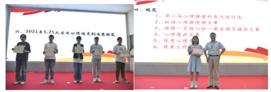 除此之外,还颁发了第六届心理形象大使大赛、微微一笑拨心弦—寻找最美微笑大赛、校园心理微视频大赛、心理漫画大赛等比赛奖项,以及年度优秀心理委员、优秀心理工作者、优秀指导教师等奖项。