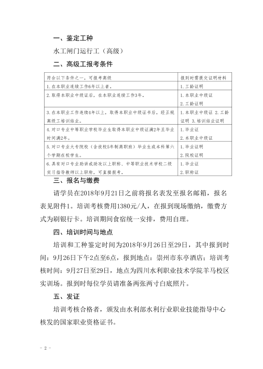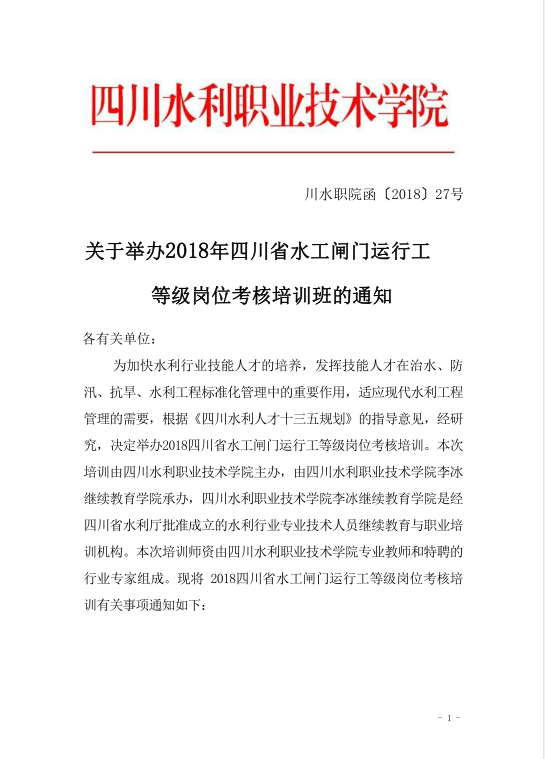 关于举办2018年四川省水工闸门运行工等级岗位考核培训班的通知