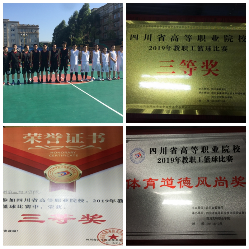 2019年10月26日由四川省教育厅主办的四川省高等职业院校教职工篮球邀请赛在四川文轩职业技术学院打响,此次比赛共有18所高职院校的教职工篮球队参加。我院教职工篮球队由学院副院长、工会主席于建华带队,李育杰、刘云飞担任教练,队员由来自不同系部的11名教职工组成。比赛场上,我院教职工在进攻端积极跑动、挡拆、掩护、突破、投篮,在防守端联防、紧逼、封盖、拼抢篮板,展现出良好的团队协作精神,经过4天的顽强拼搏,最终获得了三等奖。在比赛中我院教职工充分体现了团队协作和勇于拼搏的精神,得到了对手和观众的一致好评,也获得了体育道德风尚奖。