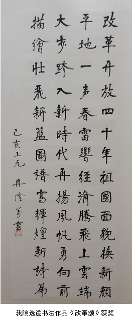 本次活动中,我院积极组织筹备选送作品荣获了三个比赛4项大奖,特别是诗歌朗诵《山·水·情》获得诗歌朗诵比赛一等奖;此外摄影作品《原始部落》获得二等奖,《沙鸥翔集》获得三等奖,书法作品《改革颂》获得三等奖。