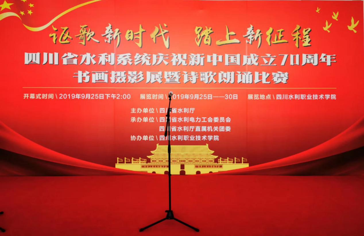 2019年9月25日下午2点由四川省水利厅主办,四川省水利水电工会委员会、四川省水利厅直属机关团委承办,四川水利职业技术学院协办以“讴歌新时代 踏上新征程”为主题,四川省水利系统庆祝新中国成立70周年书画摄影展暨诗歌朗诵比赛在我院隆重举行,厅党组书记、厅长胡云,厅党组成员、省纪委驻水利厅纪检监察组组长李启兵,厅党组成员、副厅长李永蔺,厅党组成员、副厅长谭小平,厅党组成员、厅机关党委书记赵斌出席。