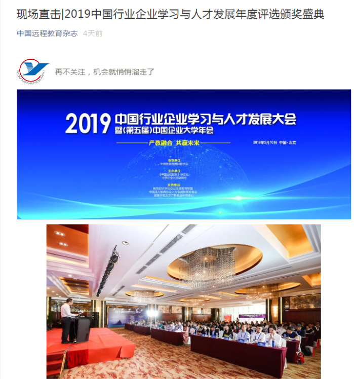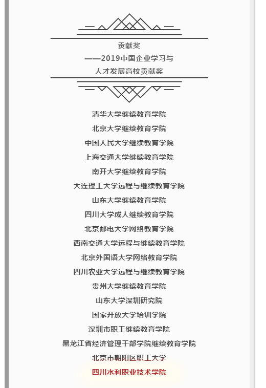 在刚刚结束的2019中国行业企业学习与人才发展大会暨(第五届)中国企业大学年会上,学院荣获2019中国企业学习与人才发展高校贡献奖。一同获此殊荣的还有清华大学继续教育学院、北京大学继续教育学院、中国人民大学继续教育学院、上海交通大学继续教育学院、南开大学继续教育学院等十八家单位。