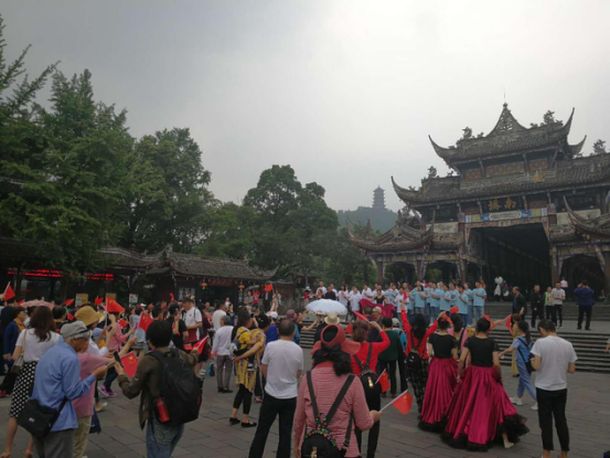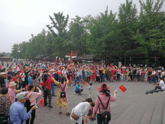 下午13:30,来不及休整与午饭的师生、摄录人员匆匆来到都江堰市南桥广场表演拍摄。带着无比的震撼和感动,游客和同学们一起互动,高唱《我和我的祖国》,把大家对祖国的爱,都化成一首述说的歌,现场气氛十分活跃。