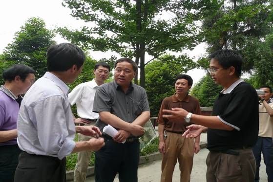 图为胡四一副部长(前排右二)在陈副厅长和学院领导的陪同下实地查看灾情