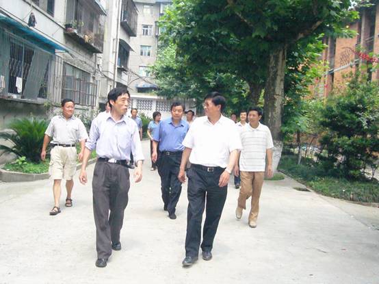 图为敬正书同志(左四)、孙砚芳同志(右二)、彭述明同志(右三)在学院领导的陪同下实地查看灾情