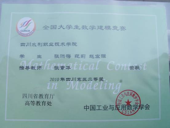 在学院于建华副院长、李亚生副院长的关心、支持下,在教务处、基础部的直接领导下,数学教研室组织学生参加了2010年9月11日至14日举行的全国大学生数学建模比赛乙组赛(注:甲组是本科组,乙组是高职高专组),我们取的很好的成绩。