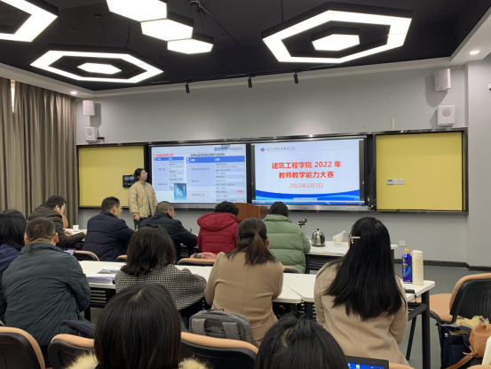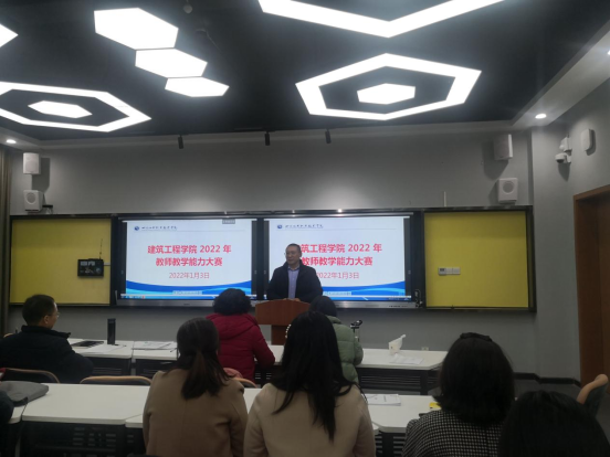 为持续深化职业教育改革,加强学院“双师型”教师队伍建设,提升我院教师教学能力、专业化水平、信息技术应用能力,2022年1月3日,建筑工程学院在2505智慧教室举行全院教师教学能力大赛。大赛由特邀嘉宾发展规划与质量管理处处长饶国清,教务处朱自强,学院党总支书记高剑飞、副院长李万渠、副书记张蕾担任评委,全体教职工参加学习观摩。