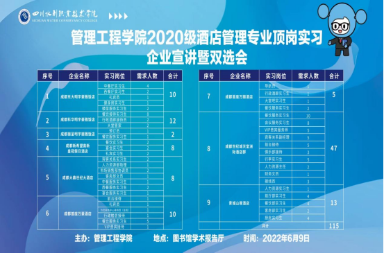 为扎实推进岗位实习工作,2022年6月9日,管理工程学院在图书馆学术报告厅成功举办2020级酒店管理专业顶岗实习企业宣讲暨双选会。张智涌副校长出席并讲话。9家酒店人事部门负责人及工作人员,教务处负责人和管理工程学院班子成员、酒店专业教师、2020级酒店专业全体学生近百人参加会议。