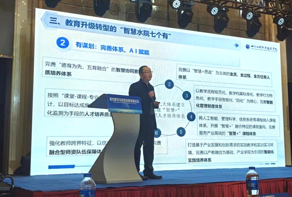 12月8日,2023年四川省高校数字化转型创新发展论坛在成都成功举行,来自全省各高校的专家和学者齐聚一堂,共同探讨高等教育数字化转型的前沿趋势和关键问题。四川水利职业技术学院作为受邀代表,由张智涌副校长以《开创教育数字化赛道上的四川水院路径》为题,在会上作专家分享报告。