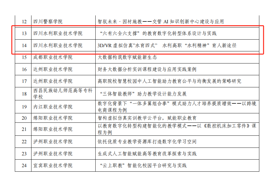 近日,四川省高等教育学会教育信息化专业委员会公布了“2024年四川省高等学校数字化优秀案例”评选结果,学校报送的《“六有六全六支撑”的教育数字化转型体系设计与实践》《3D/VR虚拟仿真“水育四式”水利高职“水利精神”》入选四川省高等教育学会教育信息化专业委员会《2024年四川省高等学校数字化优秀案例》。