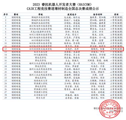 信息工程学院数字媒体技术专业学生吴鸿宇、冯苹在工业和信息化部人才交流中心、RoboCom国际公开赛组委会主办的2023睿抗(RAICOM)机器人大赛工程竞技赛道增材制造专项赛全国总决赛荣获三等奖。