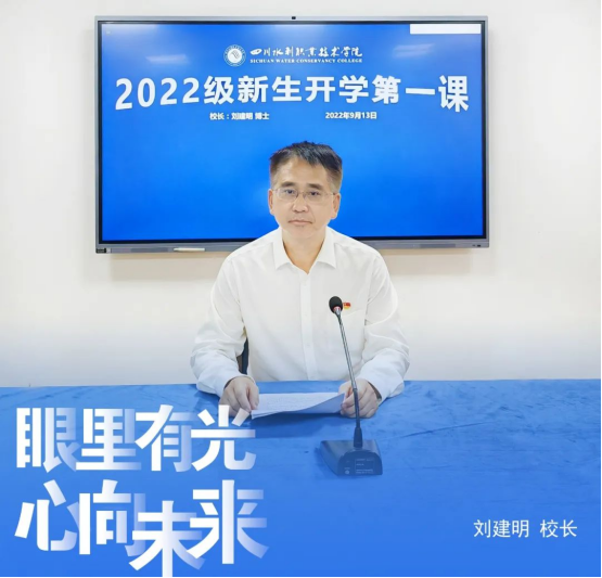 因疫情防控工作需要,四川水利职业技术学院2022级新生线下报到时间推迟延后。9月13日上午8:30,学校校长刘建明与新同学在云端相聚,他以“眼里有光 心向未来”为题,从校史校情到新时代水利人的担当与使命,为全体新生带来了一堂生动、深刻的“开学第一课”,勉励同学们要扎根铸魂、坚定信念,要认准目标、追求卓越,要脚踏实地、锤炼技能。