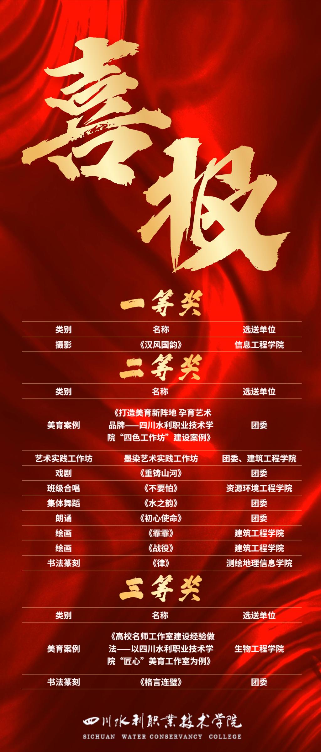 8月19日—29日,四川省教育厅主办的四川省第十届大学生艺术展演活动在成都师范学院举行,我校副校长王宾带队指导,团委、后勤基建处、各二级学院等相关部门参与此次活动。我校选送作品取得1项一等奖、9项二等奖、2项三等奖,创造了我校在此项赛事上的最好成绩。