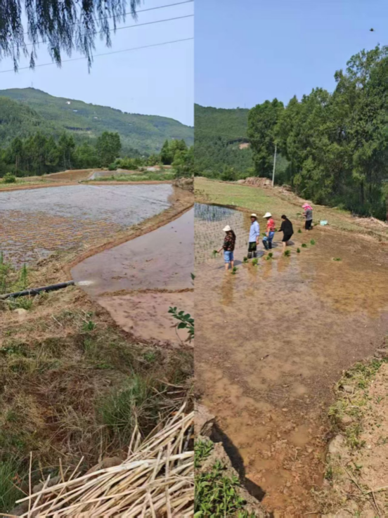 驻村工作队与“村两委”迅速将抗旱设备投入到农业生产中,配合提灌站,从山脚水库提水,再使用设备将水抽送到需要插秧的田地,保障了近50亩地的生产用水,帮助村民完成了水稻秧苗的栽种。
