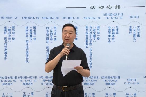 王宾宣布第十三届社团文化艺术节开幕,为这场青春盛会拉开了精彩序幕。他在致辞中充分肯定了学生社团在校园文化建设中的重要作用,强调社团是“传承创新的平台、实践育人的沃土”,学校始终秉持“以文化人、以美育人”的理念,支持社团百花齐放、创新发展。希望学生社团把牢政治方向,紧扣我校红蓝金“三色”育人理念,坚持五育并举,实现文化育人品牌的多元化和特色化导向;希望社团管理部门紧密结合主流旋律、文化理念和育人方法等,持续提升和丰富社团文化艺术节的内涵和影响力;希望青年学子以青春视角诠释时代主题,用社团文化传承家国情怀,以艺术滋养心灵,以奋斗书写青春,在社团活动中锤炼本领、激扬梦想。