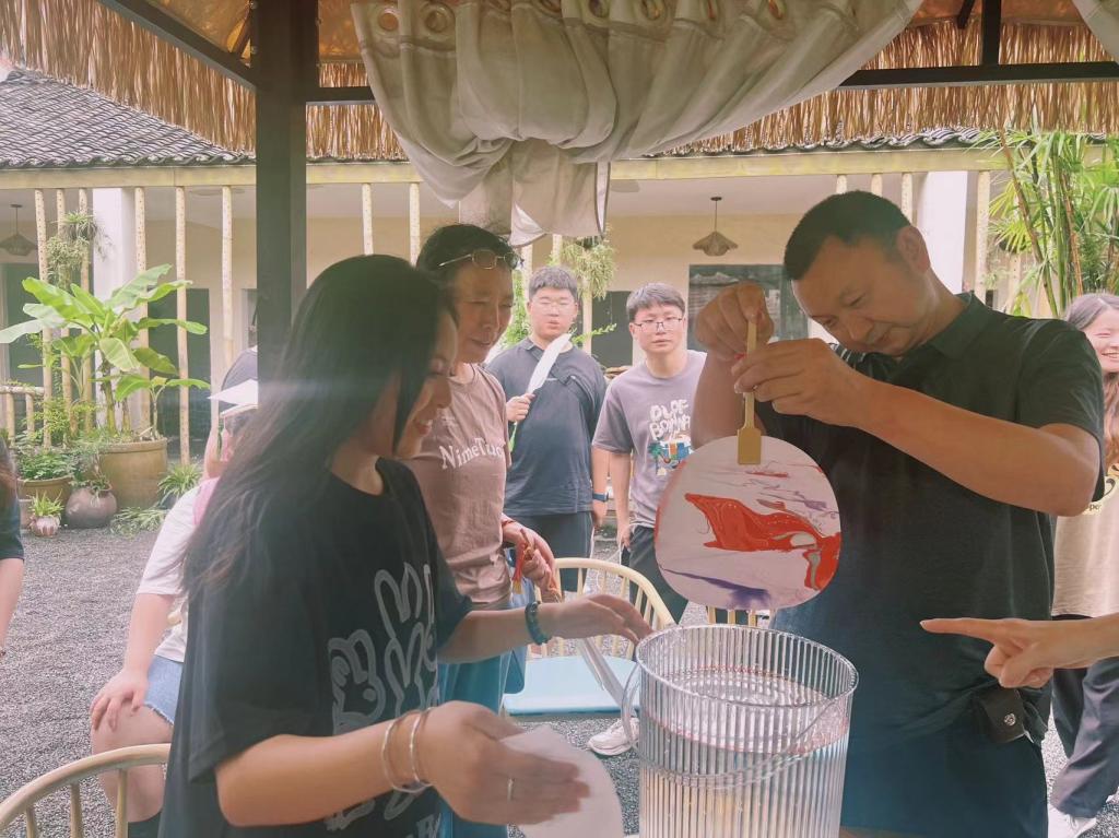 参观学习后,师生共同体验漆扇制作。漆扇是一种非遗手工艺品,以漆为笔,以水为墨,一进一出间,东方色彩便跃于扇上,具有独特的艺术价值和历史文化价值。在制作的过程中,师生共同备漆、题字,通过旋转或轻摇等形式漂出了一把把精美绝伦的扇面。制作完成后,师生互赠漆扇,扇面寥寥几字却传达了师生间的深深祝愿。