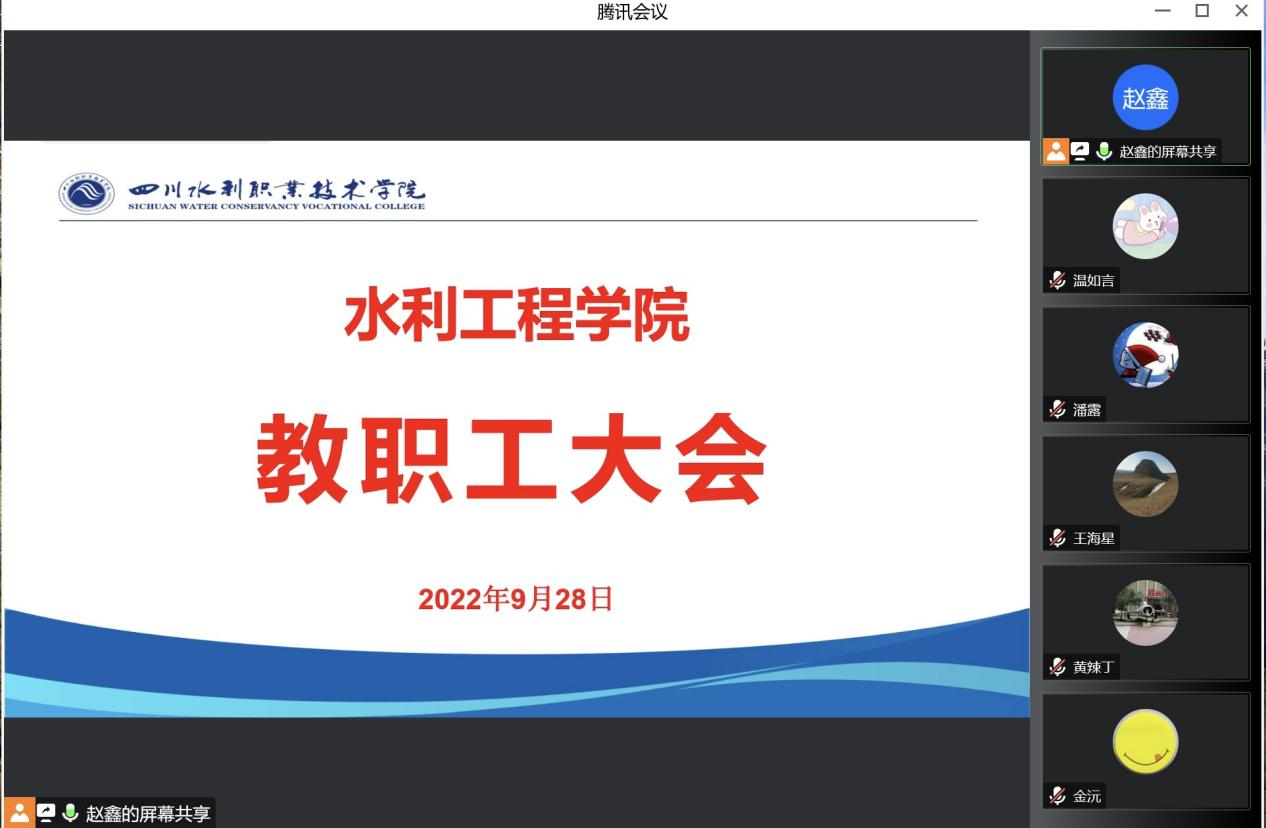 2022年9月28日下午,水利工程学院通过腾讯会议线上召开教职工大会。会议由水利工程学院党总支副书记、院长赵鑫主持,学院党总支副书记吴限、副院长张磊、张仲驰及全体教职工参加了本次会议。