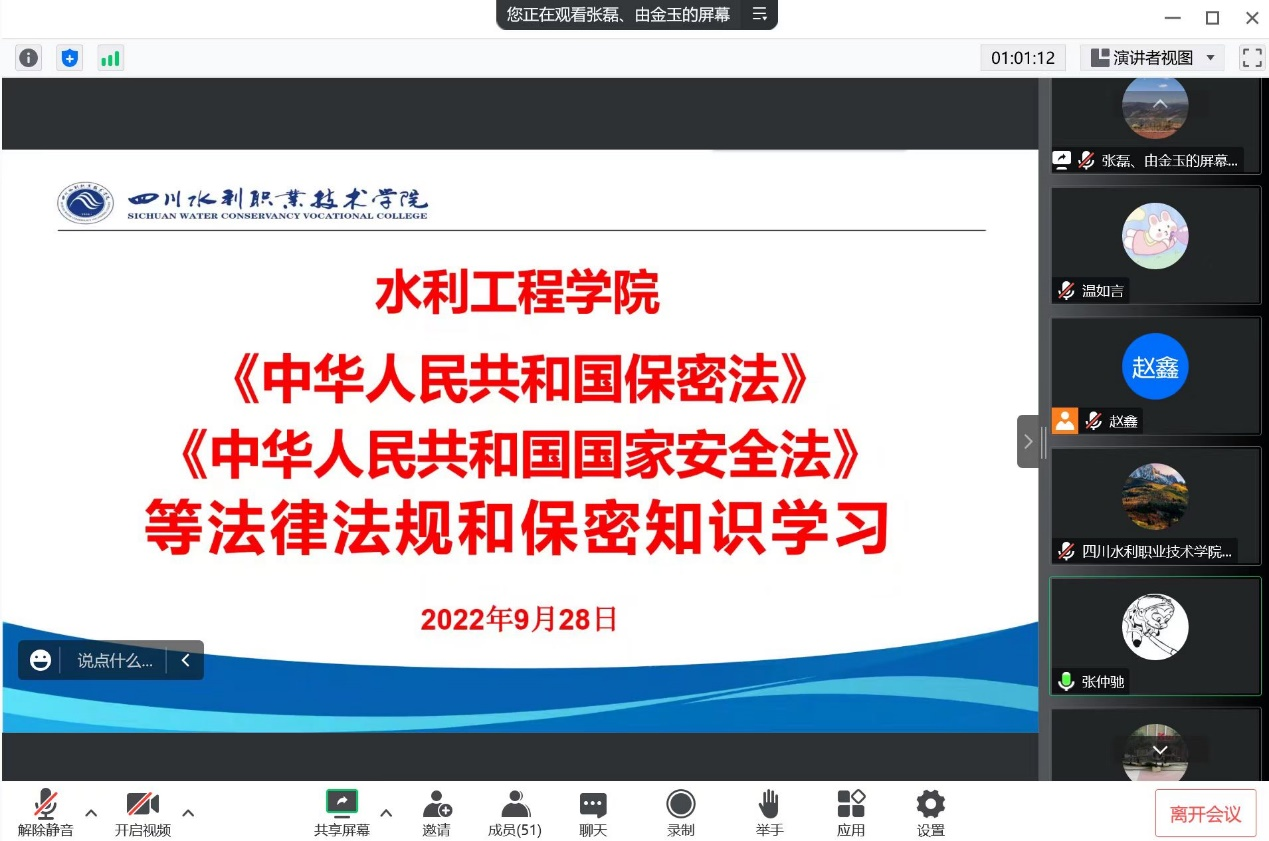 水利工程学院副院长张仲驰同志在学习会上宣读了《中华人民共和国保守国家保密法》《中华人民共和国国家安全法》主要内容,并通过9个相关案例针对9种违法情况开展学习。水利工程学院力求通过本次学习努力做到一要深刻认识保密工作的重要性,切实增强做好保密工作的自觉性,夯实基础,提高保密防范意识,增强保密防范能力;二要警钟长鸣、加强学习,全院教职工要切实加强对《保密法》的学习,特别涉密人员要明白《保密法》的主要精神,法律禁止的相关行为,违反保密法规的法律责任;三要坚持党管保密,严格依法治密,加强组织领导和机构队伍建设,确保保密工作责任落实,要以落实领导责任制为抓手,构建保密工作合力。