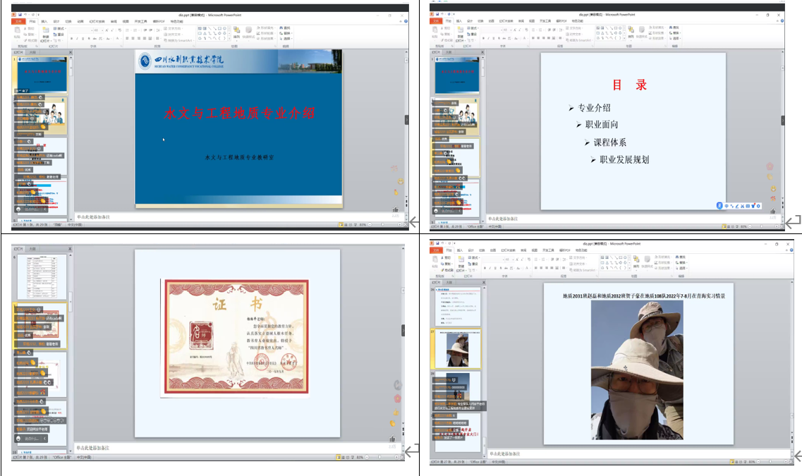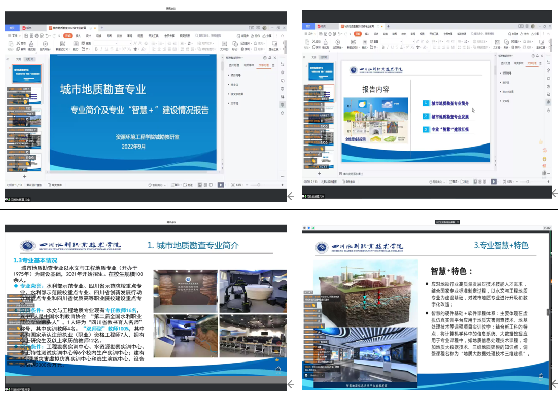城市地质勘查专业带头人闫胜老师从专业的建设背景、发展历程、课程设置、就业前景等方面展开介绍,就“勘查”与“勘察“做了详细解读。就专业智慧+建设作了汇报:对城市地质专业进行升级和数字化改造,将虚拟仿真实训平台应用于地质灾害调查技术、地基处理技术等课程项目实训教学;将计算机学科中的信息系统、大数据挖掘应用于专业课程中。