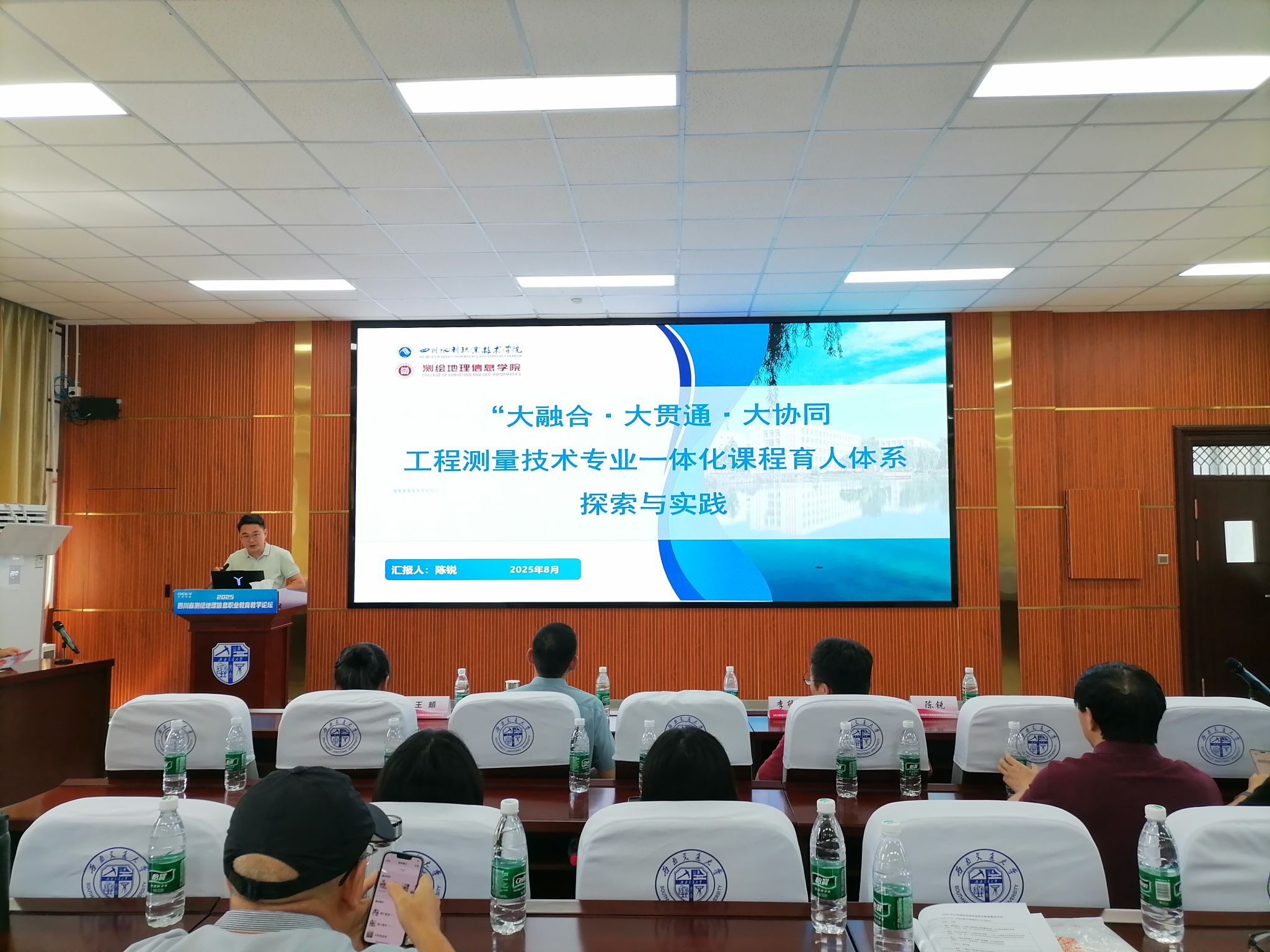 四川水利职业技术学院副教授陈锐围绕“大融合·大贯通·大协同”工程测量技术专业一体化课程育人体系探索与实践”进行汇报。他提出,党建引领,三全五育,构建一体化课程育人体系,充分利用四川省测绘地理信息行业产教融合共同体等平台,推动育人队伍协同发展,为四川省测绘地理信息行业高质量发展贡献水院力量。