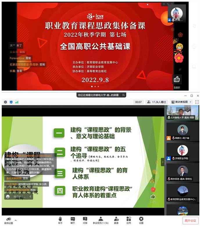 根据《关于公共基础课课程思政集体备课的通知》,马克思主义学院全体教师9月8日参加了教育部职业发展中心举办的“2022全国职业院校公共基础课课程思政集体备课会”。