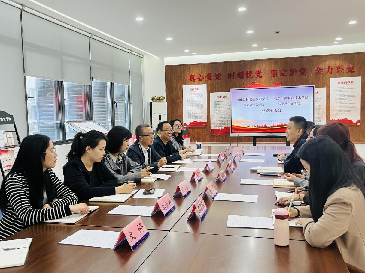 为更好地落实党中央关于加强新时代马克思主义学院建设的部署,加强我校校思想政治理论课建设,促进高校马克思主义学院之间交流与合作,2024年10月18日,我校马克思主义学院班子成员、教研室主任、新进思政教师一行7人赴成都工贸技术学院马克思主义学院学习交流。成都工贸职业技术学院马克思主义学院班子成员、教研室主任和新进思政教师参加交流座谈。