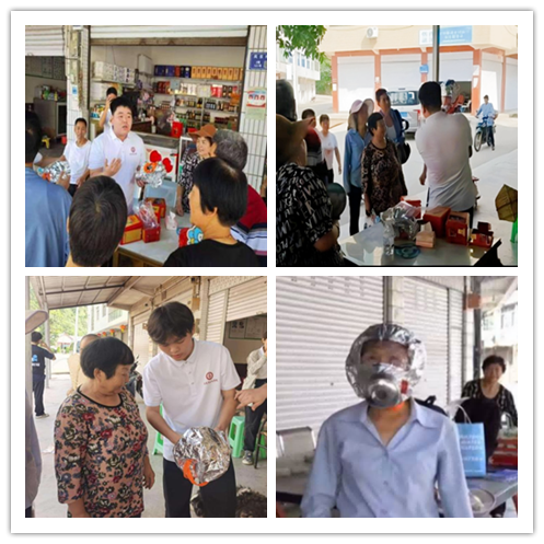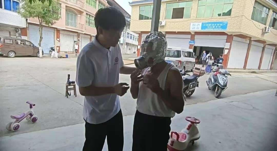 随后,志愿者们还面对面手把手教村民安全佩戴防毒面罩志愿者先做标准示范,再分步讲解“检查面罩与滤毒罐、正确佩戴(托住面罩、贴合脸部、调节头带)及密合性测试”。村民们轮流实操,志愿者在旁细心纠正,总结出 “一查二戴三收紧” 的口诀,强化记忆,把安全防护的 “预防针” 打到实处。