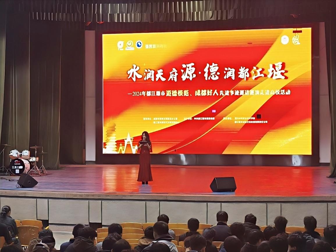 2024年11月27日,由都江堰市委宣传部主办的“水润天府源 德润都江堰”巡讲巡演团队来到我校都江堰校区,与我校区联合举办2024年都江堰市道德模范、成都好人先进事迹巡讲巡演活动。这是一场融合了道德力量与艺术魅力的特殊活动,为都江堰校区数百名师生带来了一场触动心灵的盛宴。