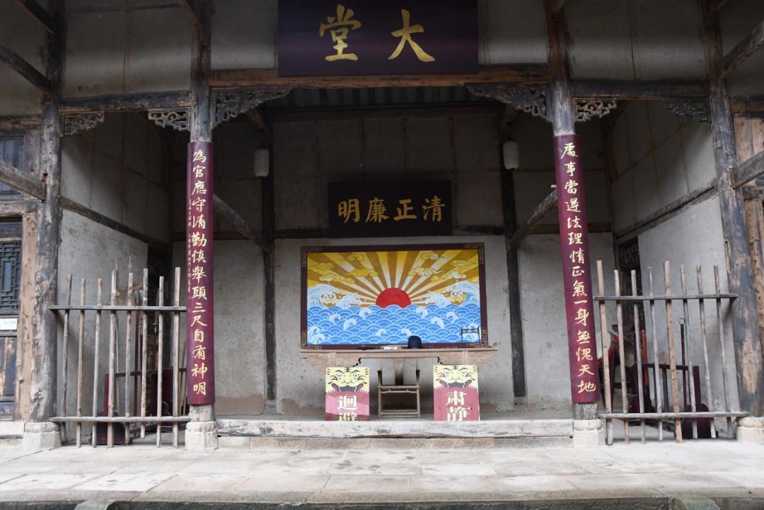 继续跟着老师往前走,一路上欢声笑语,气氛格外融洽。不久后,我们看到了旧时的衙门所在,名为“柏龙分司”。跨进院子,看到了以前的公堂,墙上绘有“海水朝日”图,上有“清正廉明”四个大字,案桌前摆有“回避”“肃静”两块木牌子。这不正是我们在影视剧里看惯了的县大老爷审案的场所么?老师们一时兴起,带着大家进行了个小互动:有人扮演“知县”,有人客串“犯人”与“捕快”,一场模拟古代断案的小剧即刻上演,把人笑得前俯后仰的。