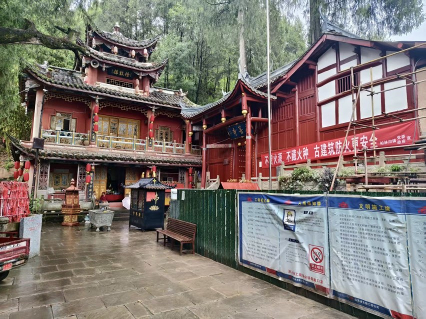 走到古街尽头,抬眼便是绵延的青山、茂密的柏树与缭绕的云雾,一棵千年古柏屹立在此,既显壮观,又引人深思——它就像古镇的守护者,静静见证着岁月流转,也守护着不远处香火延续的寺庙。寺庙名为“广善寺”。
