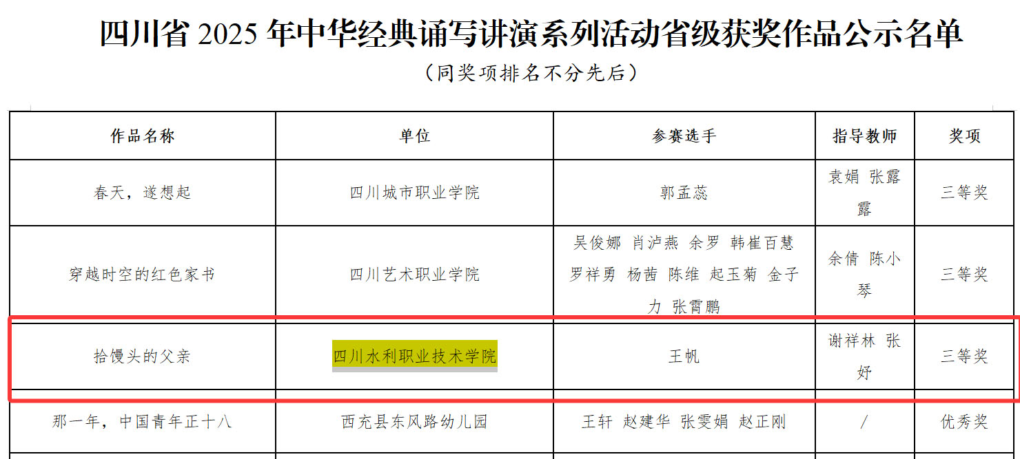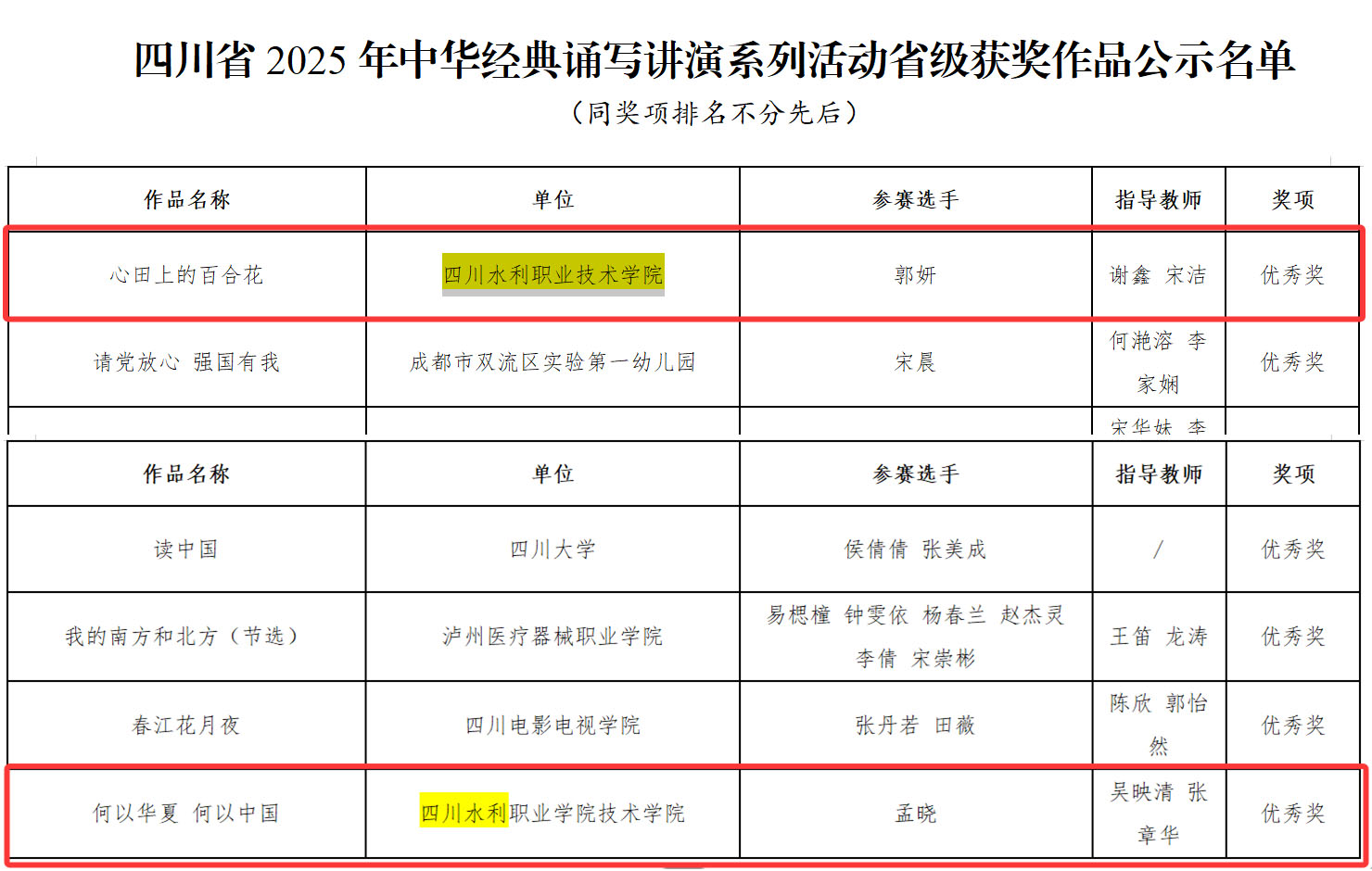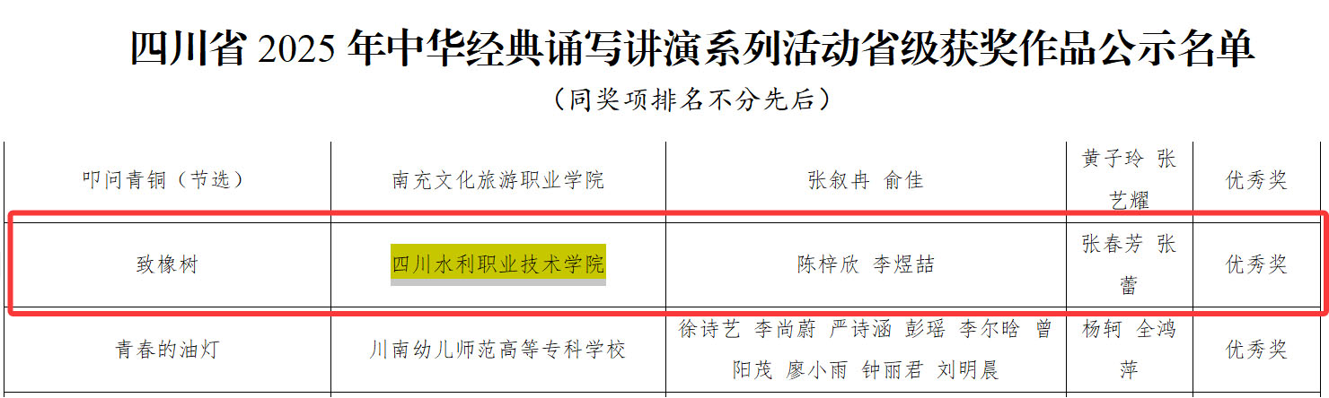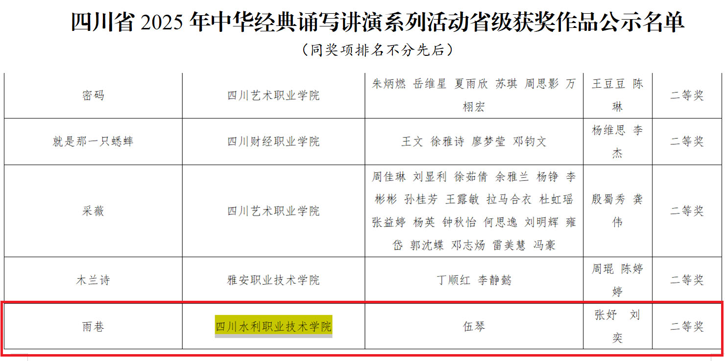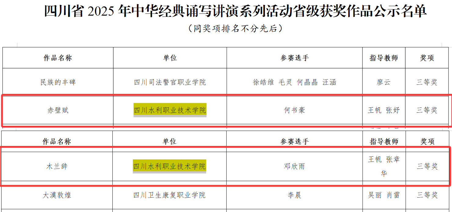 近日,由四川省教育厅、四川省语言文字工作委员会联合主办的四川省 2025 年中华经典诵写讲演系列活动获奖名单正式公布。四川水利职业技术学院师生积极参赛、表现突出,共斩获 7 项奖项,其中教师组 3 项、学生组 4 项,以扎实的语言文字功底与深厚的文化素养,在全省高校中展现了水校院风采。