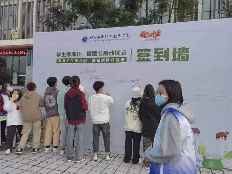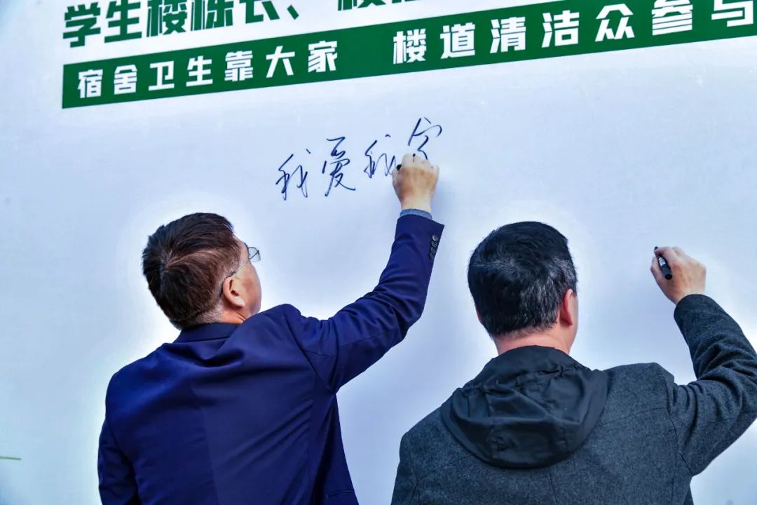 会议结束后,全体参会人员移步图书馆门厅进行签名墙签名及合影,相机记录大家夕阳下的容颜,也记录了大家定能打赢宿舍干净整洁攻坚战的决心。