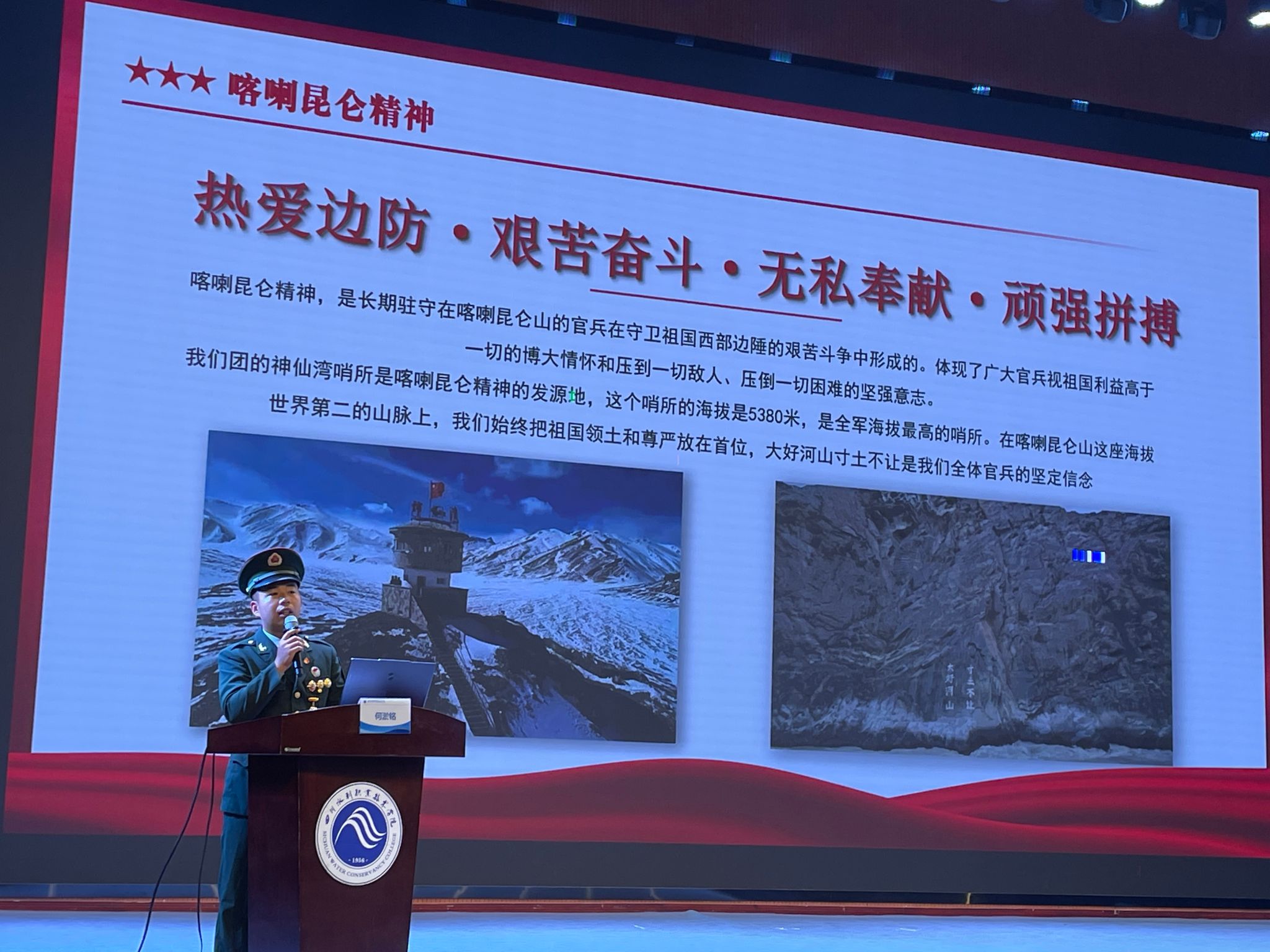 讲座中,何淤铭教官结合亲身经历,生动讲述了戍边官兵在高寒缺氧的“生命禁区”爬冰卧雪、坚守岗位的日常,通过惊心动魄的抢险故事与“舍小家为大家”的感人场景,深刻诠释了新时代革命军人“宁可向前十步死,绝不后退半步生”的铮铮誓言,系统阐释了“热爱边防、艰苦斗争、无私奉献、顽强拼搏”的喀喇昆仑精神。他勉励同学们,虽身处和平校园,仍需常怀忧患意识,从英雄事迹中汲取精神力量,锻造坚韧意志。教官饱含深情的讲述令现场新生深受震撼,不少同学热泪盈眶,纷纷表示:“作为新时代大学生,虽不必人人戍边,但要始终守护心中的‘精神高原’,将爱国奉献、艰苦奋斗的精神融入学习和未来事业中。”