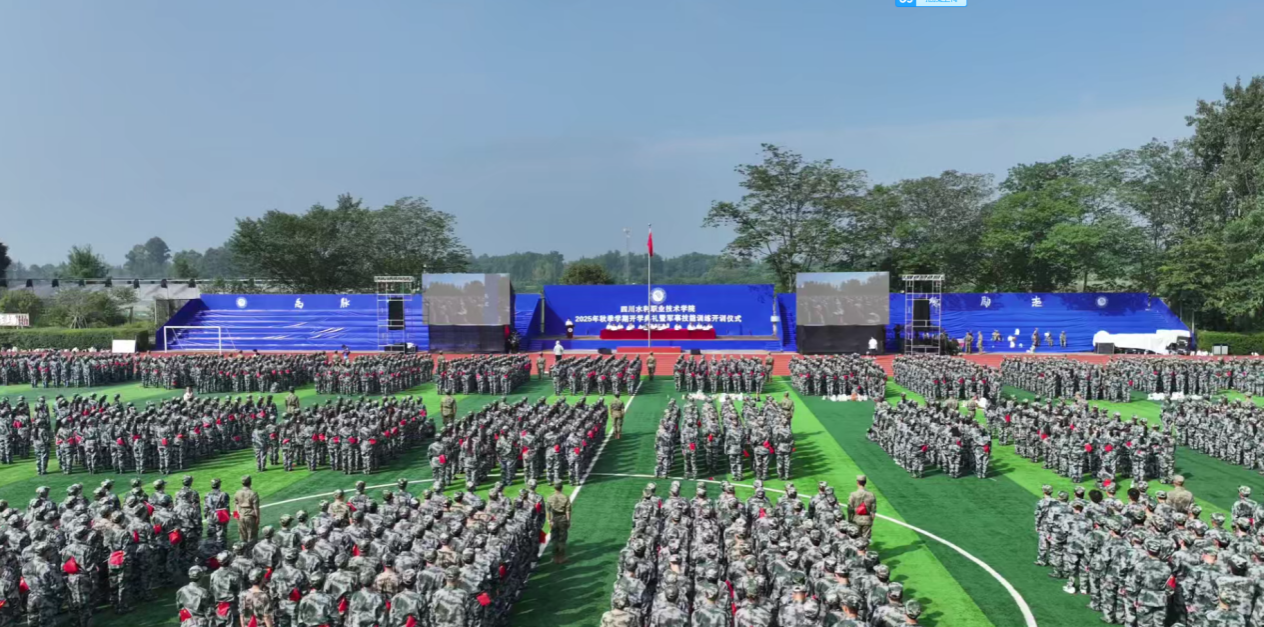 9月22日,四川水利职业技术学院2025级新生军事技能训练结训仪式在羊马校区运动场隆重举行。仪式现场细雨...